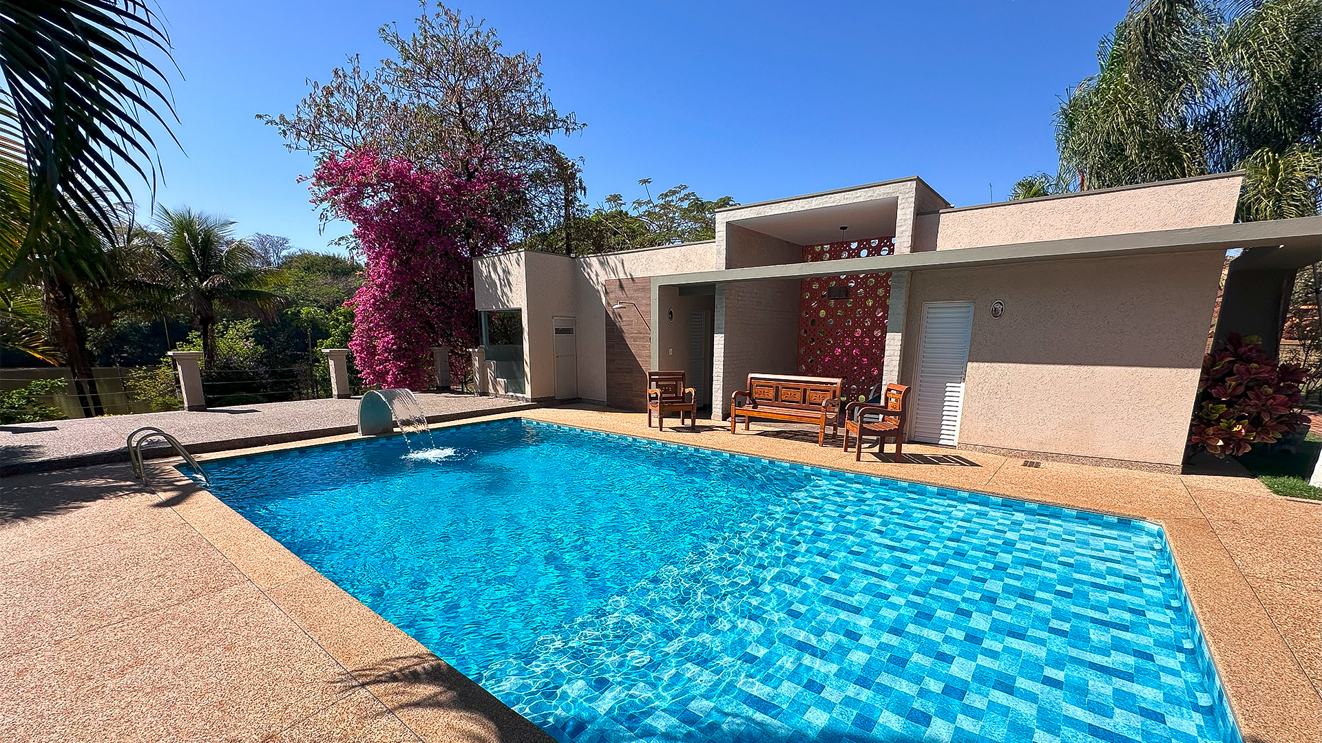 Piscinas pequenas combinam com estampas claras e pequenas, que ampliam o ambiente.